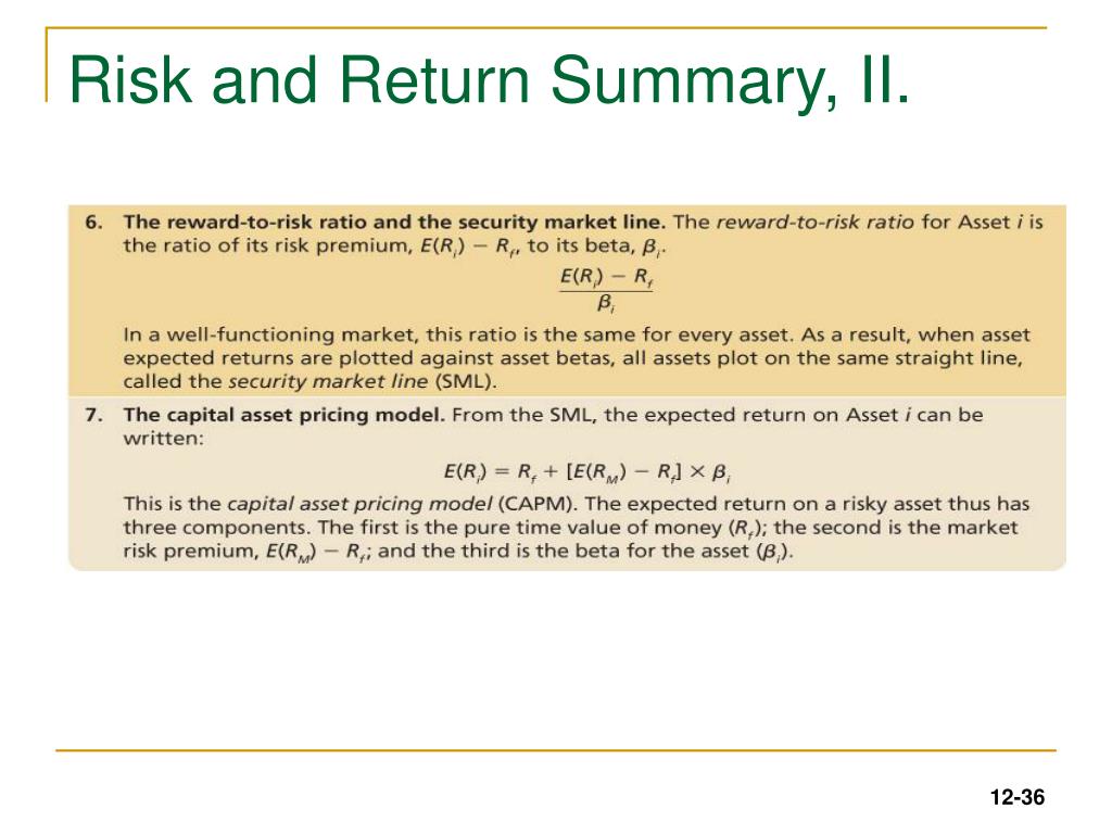 The Security Market Line • The Capital Asset Pricing Model (CAPM) is a theoryof risk and return for securities in a competitive capital market. • The CAPM shows that E(Ri) depends on: • Rf, the pure time value of money. • E(RM) – Rf, the reward for bearing systematic risk. • i, the amount of systematic risk. (12.7)