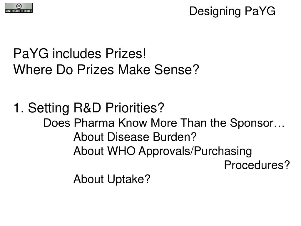 Designing PaYG PaYG includes Prizes! Where Do Prizes Make Sense? 1. Setting R&D Priorities? Does Pharma Know More Than the Sponsor… About Disease Burden? About WHO Approvals/Purchasing Procedures? About Uptake?