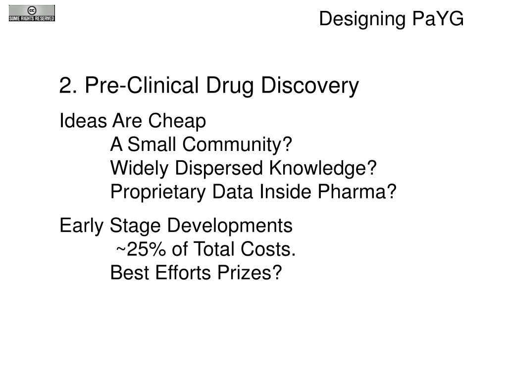 Designing PaYG 2. Pre-Clinical Drug Discovery Ideas Are Cheap A Small Community? Widely Dispersed Knowledge? Proprietary Data Inside Pharma? Early Stage Developments ~25% of Total Costs. Best Efforts Prizes?