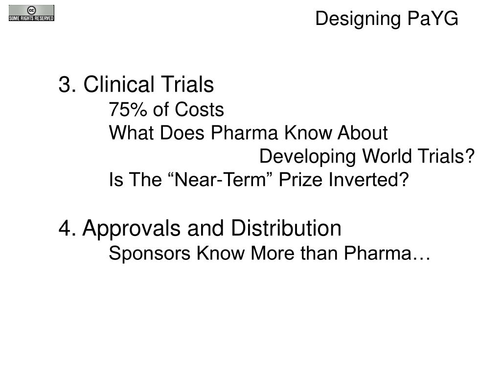 Designing PaYG 3. Clinical Trials 75% of Costs What Does Pharma Know About Developing World Trials? Is The “Near-Term” Prize Inverted? 4. Approvals and Distribution Sponsors Know More than Pharma…