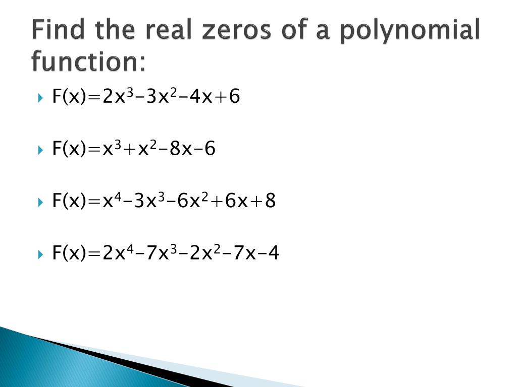 Find the real zeros of a polynomial function: • F(x)=10x5-3x2+x-6