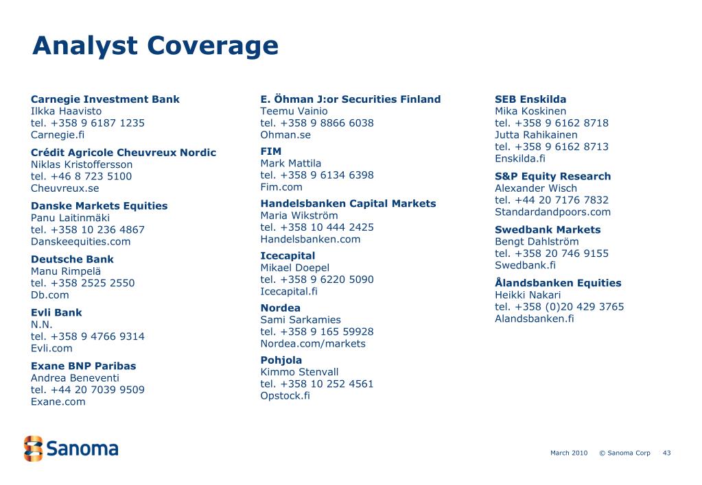 Analyst Coverage Carnegie Investment Bank Ilkka Haavisto tel. +358 9 6187 1235 Carnegie.fi Crédit Agricole Cheuvreux Nordic Niklas Kristofferssontel. +46 8 723 5100Cheuvreux.se Danske Markets EquitiesPanu Laitinmäkitel. +358 10 236 4867Danskeequities.com Deutsche BankManu Rimpelätel. +358 2525 2550Db.com Evli Bank N.N.tel. +358 9 4766 9314Evli.com Exane BNP ParibasAndrea Beneventitel. +44 20 7039 9509Exane.com E. Öhman J:or Securities FinlandTeemu Vainio tel. +358 9 8866 6038 Ohman.se FIMMark Mattilatel. +358 9 6134 6398 Fim.com Handelsbanken Capital MarketsMaria Wikströmtel. +358 10 444 2425 Handelsbanken.com IcecapitalMikael Doepeltel. +358 9 6220 5090Icecapital.fi NordeaSami Sarkamiestel. +358 9 165 59928Nordea.com/markets PohjolaKimmo Stenvalltel. +358 10 252 4561Opstock.fi SEB EnskildaMika Koskinentel. +358 9 6162 8718Jutta Rahikainentel. +358 9 6162 8713Enskilda.fi S&P Equity ResearchAlexander Wisch tel. +44 20 7176 7832Standardandpoors.com Swedbank MarketsBengt Dahlströmtel. +358 20 746 9155Swedbank.fi Ålandsbanken EquitiesHeikki Nakaritel. +358 (0)20 429 3765Alandsbanken.fi
