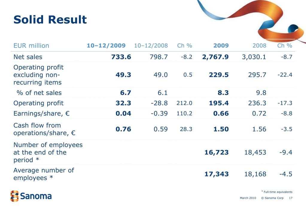 Sanoma Entertainment Key figures Outlook for 2010: Net sales and operating profit excluding non-recurring items are expected to be at the previous year’s level.
