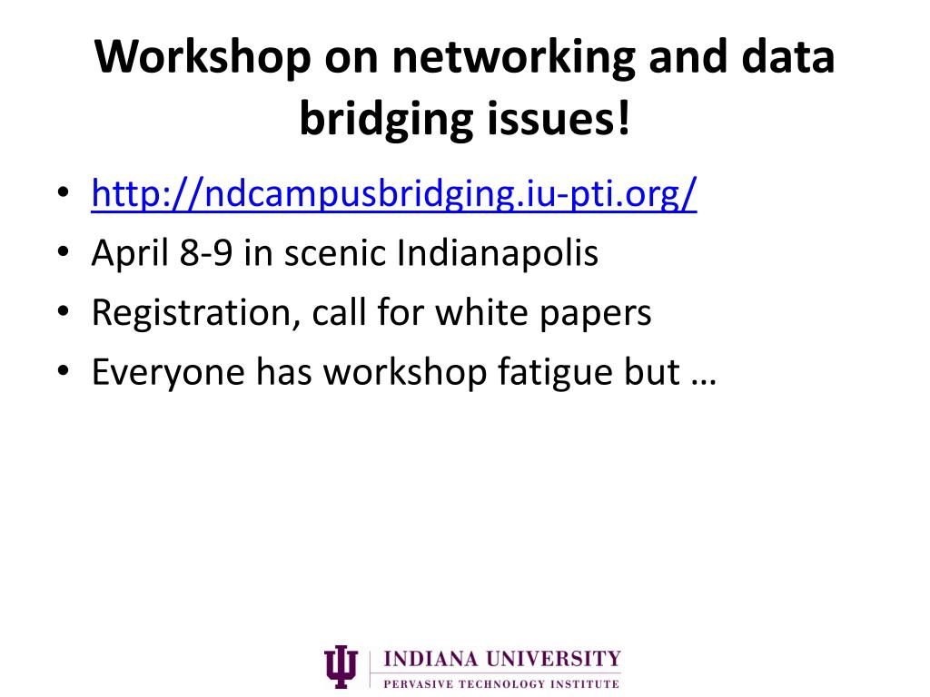 Workshop on networking and data bridging issues! http://ndcampusbridging.iu-pti.org/ April 8-9 in scenic Indianapolis Registration, call for white papers Everyone has workshop fatigue but …