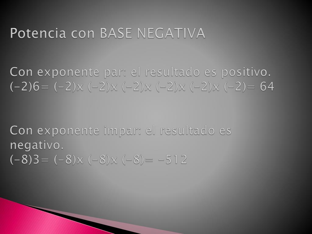 Potencia con BASE NEGATIVACon exponente par: el resultado es positivo.(-2)6= (-2)x (-2)x (-2)x (-2)x (-2)x (-2)= 64Con exponente impar: el resultado es negativo.(-8)3= (-8)x (-8)x (-8)= -512
