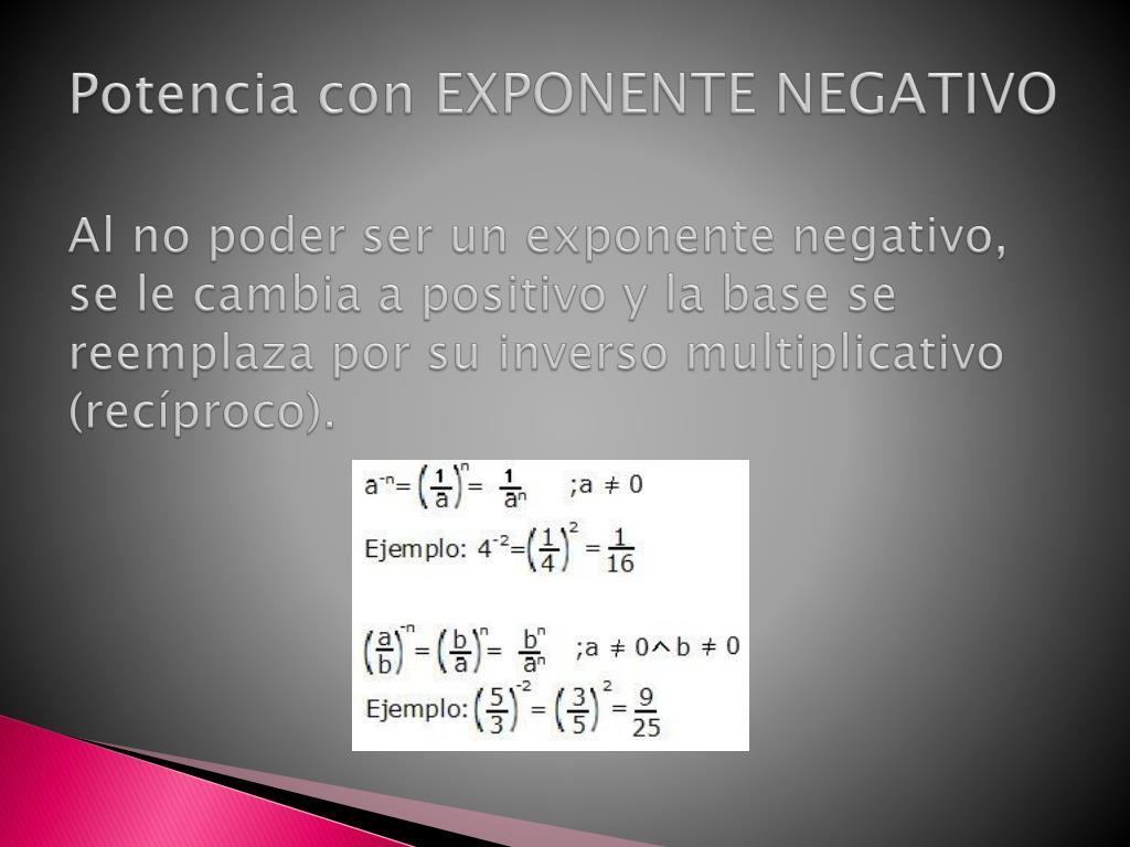 Potencia con EXPONENTE NEGATIVOAl no poder ser un exponente negativo, se le cambia a positivo y la base se reemplaza por su inverso multiplicativo (recíproco).
