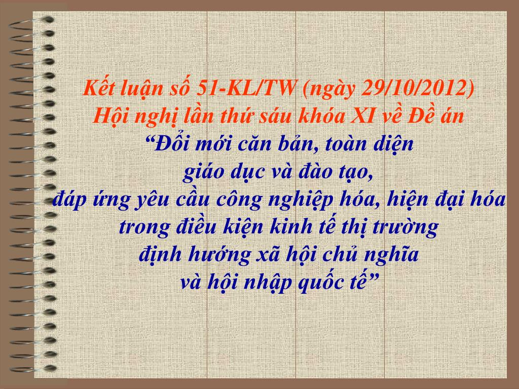 Kết luận số 51-KL/TW (ngày 29/10/2012) Hội nghị lần thứ sáu khóa XI về Đề án “Đổi mới căn bản, toàn diện giáo dục và đào tạo, đáp ứng yêu cầu công nghiệp hóa, hiện đại hóa trong điều kiện kinh tế thị trường định hướng xã hội chủ nghĩa và hội nhập quốc tế”