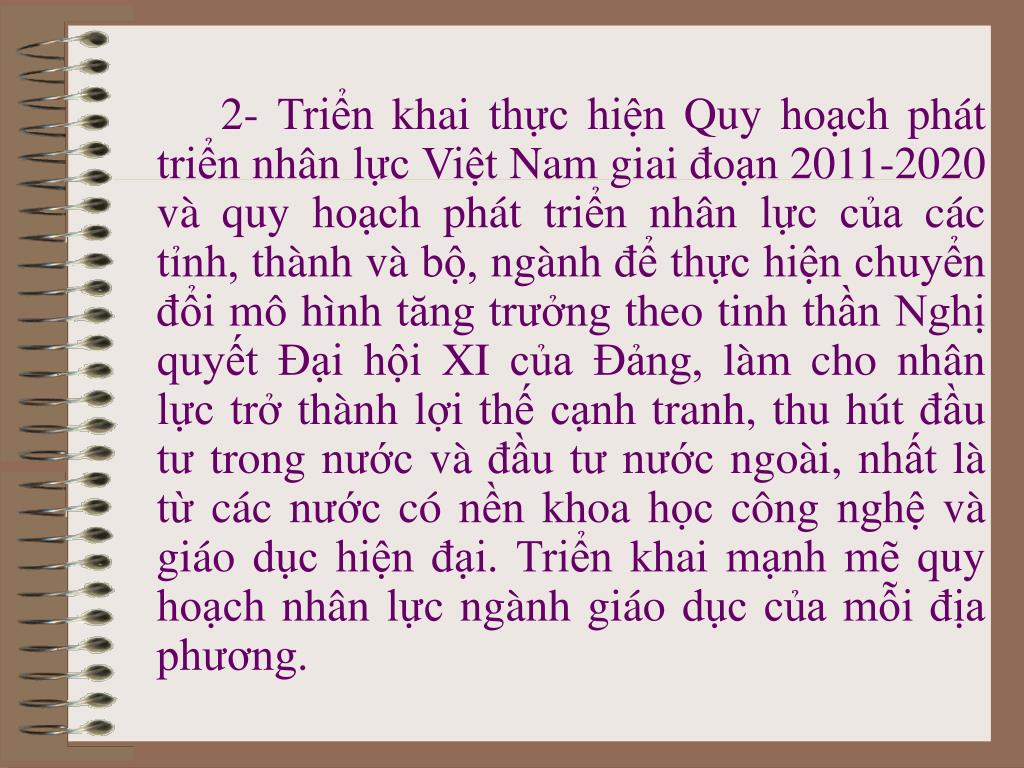 2- Triển khai thực hiện Quy hoạch phát triển nhân lực Việt Nam giai đoạn 2011-2020 và quy hoạch phát triển nhân lực của các tỉnh, thành và bộ, ngành để thực hiện chuyển đổi mô hình tăng trưởng theo tinh thần Nghị quyết Đại hội XI của Đảng, làm cho nhân lực trở thành lợi thế cạnh tranh, thu hút đầu tư trong nước và đầu tư nước ngoài, nhất là từ các nước có nền khoa học công nghệ và giáo dục hiện đại. Triển khai mạnh mẽ quy hoạch nhân lực ngành giáo dục của mỗi địa phương.