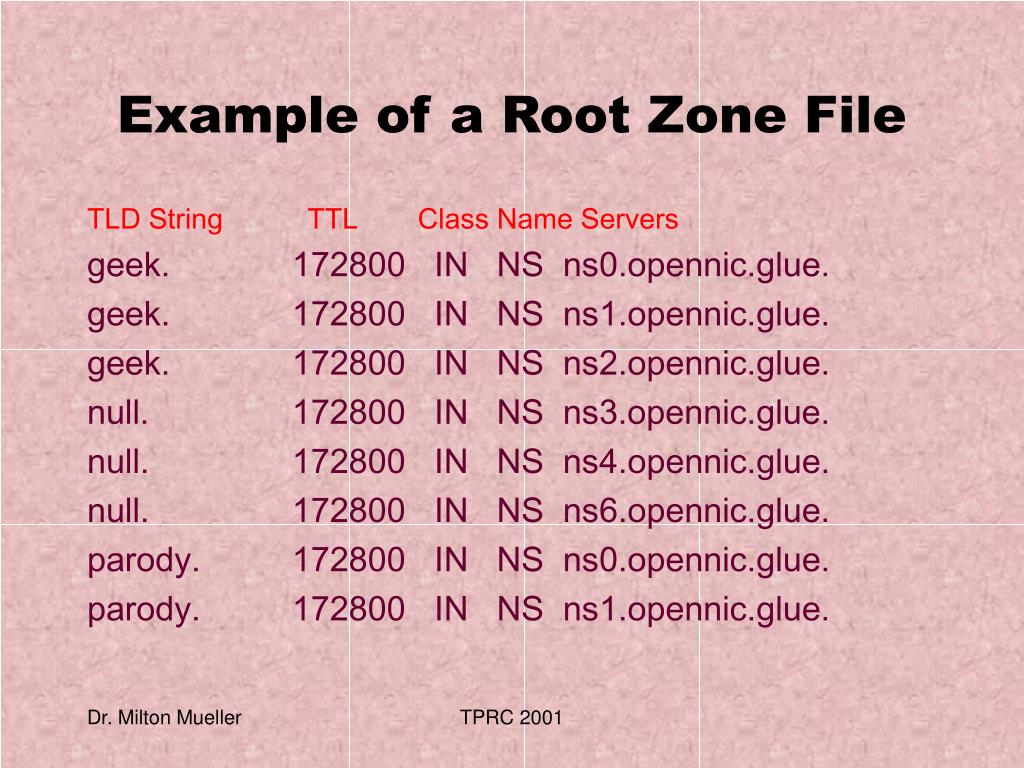 Example of a Root Zone File TLD String TTL Class Name Servers geek. 172800 IN NS ns0.opennic.glue. geek. 172800 IN NS ns1.opennic.glue. geek. 172800 IN NS ns2.opennic.glue. null. 172800 IN NS ns3.opennic.glue. null. 172800 IN NS ns4.opennic.glue. null. 172800 IN NS ns6.opennic.glue. parody. 172800 IN NS ns0.opennic.glue. parody. 172800 IN NS ns1.opennic.glue. TPRC 2001