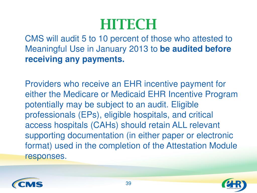 HITECH CMS will audit 5 to 10 percent of those who attested to Meaningful Use in January 2013 to be audited before receiving any payments. Providers who receive an EHR incentive payment for either the Medicare or Medicaid EHR Incentive Program potentially may be subject to an audit. Eligible professionals (EPs), eligible hospitals, and critical access hospitals (CAHs) should retain ALL relevant supporting documentation (in either paper or electronic format) used in the completion of the Attestation Module responses.