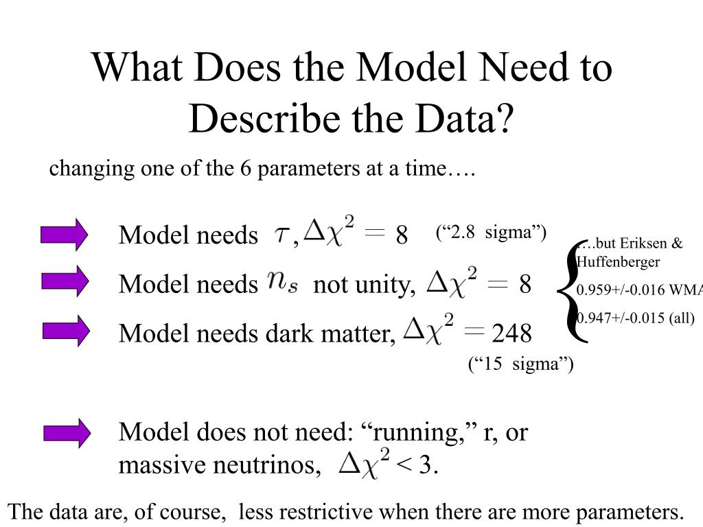 Model needs , 8 Model needs not unity, 8 Model needs dark matter, 248 Model does not need: “running,” r, or massive neutrinos, < 3. What Does the Model Need to Describe the Data? changing one of the 6 parameters at a time…. { (“2.8 sigma”) ….but Eriksen & Huffenberger 0.959+/-0.016 WMAP 0.947+/-0.015 (all) (“15 sigma”) The data are, of course, less restrictive when there are more parameters.