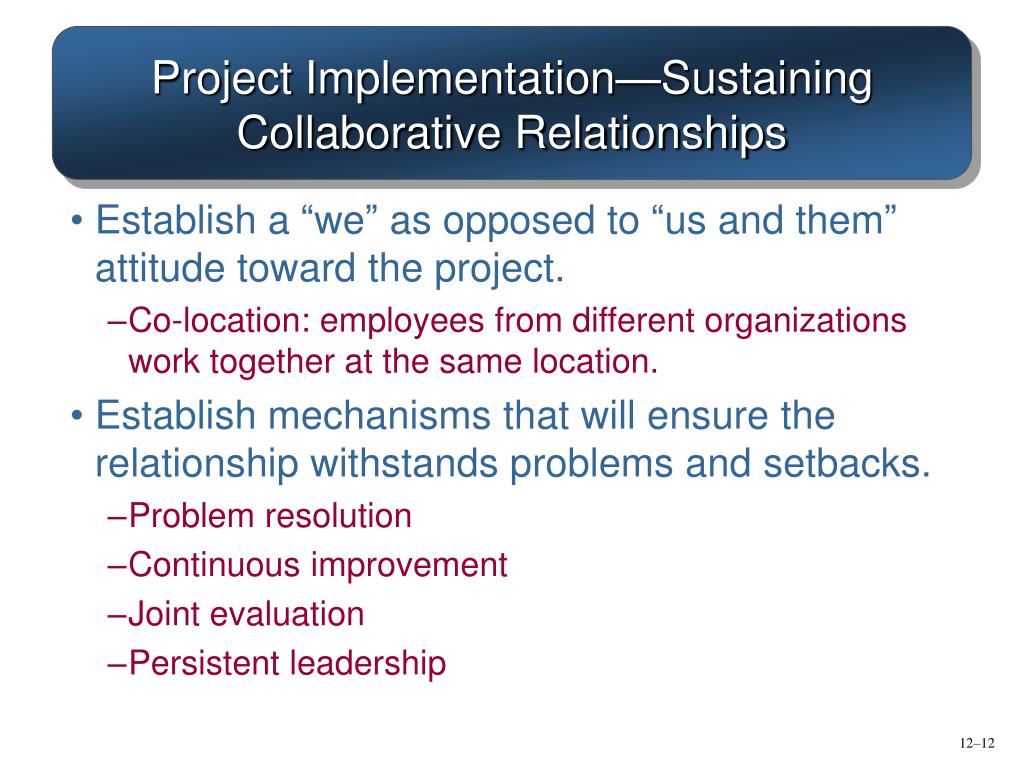 Project Implementation—Sustaining Collaborative Relationships • Establish a “we” as opposed to “us and them” attitude toward the project. • Co-location: employees from different organizations work together at the same location. • Establish mechanisms that will ensure the relationship withstands problems and setbacks. • Problem resolution • Continuous improvement • Joint evaluation • Persistent leadership
