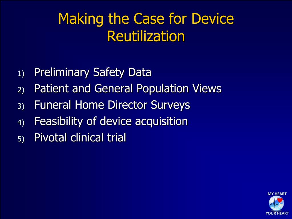 Making the Case for Device Reutilization • Preliminary Safety Data • Patient and General Population Views • Funeral Home Director Surveys • Feasibility of device acquisition • Pivotal clinical trial