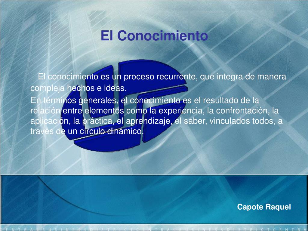 El Conocimiento El conocimiento es un proceso recurrente, que integra de manera compleja hechos e ideas. En términos generales, el conocimiento es el resultado de la relación entre elementos como la experiencia, la confrontación, la aplicación, la práctica, el aprendizaje, el saber, vinculados todos, a través de un círculo dinámico. Capote Raquel