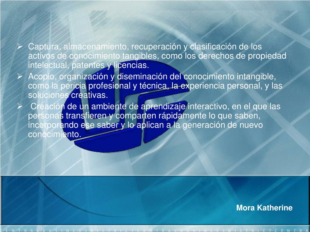 Captura, almacenamiento, recuperación y clasificación de los activos de conocimiento tangibles, como los derechos de propiedad intelectual, patentes y licencias. • Acopio, organización y diseminación del conocimiento intangible, como la pericia profesional y técnica, la experiencia personal, y las soluciones creativas. • Creación de un ambiente de aprendizaje interactivo, en el que las personas transfieren y comparten rápidamente lo que saben, incorporando ese saber y lo aplican a la generación de nuevo conocimiento. Mora Katherine