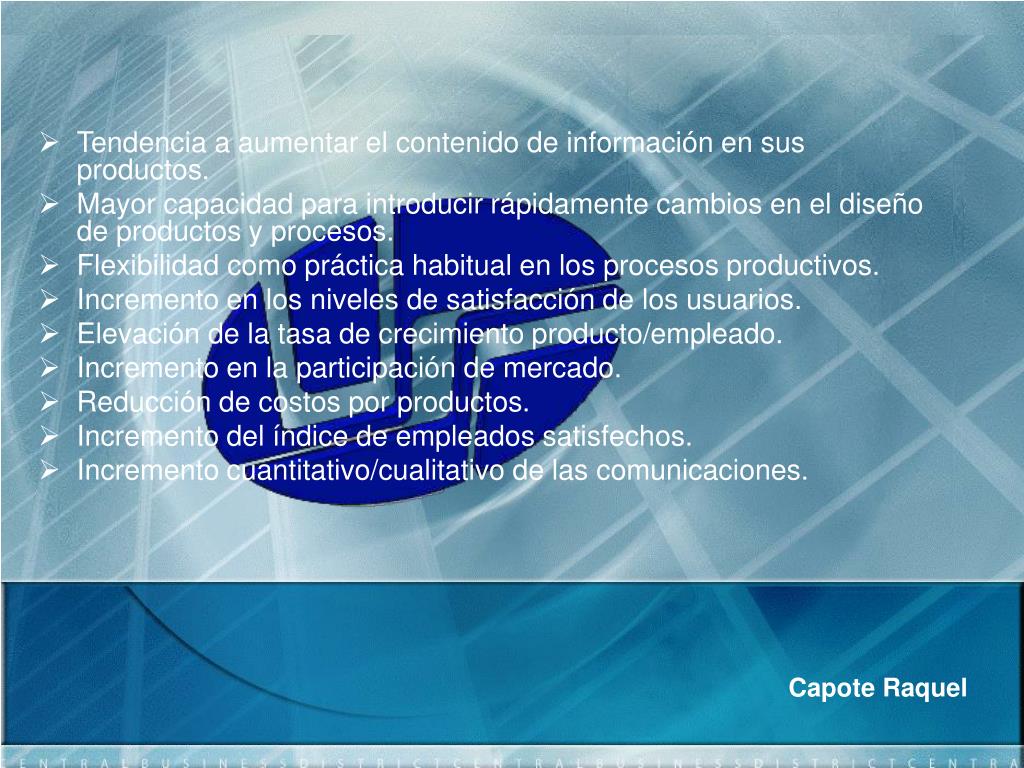 Tendencia a aumentar el contenido de información en sus productos. • Mayor capacidad para introducir rápidamente cambios en el diseño de productos y procesos. • Flexibilidad como práctica habitual en los procesos productivos. • Incremento en los niveles de satisfacción de los usuarios. • Elevación de la tasa de crecimiento producto/empleado. • Incremento en la participación de mercado. • Reducción de costos por productos. • Incremento del índice de empleados satisfechos. • Incremento cuantitativo/cualitativo de las comunicaciones. Capote Raquel