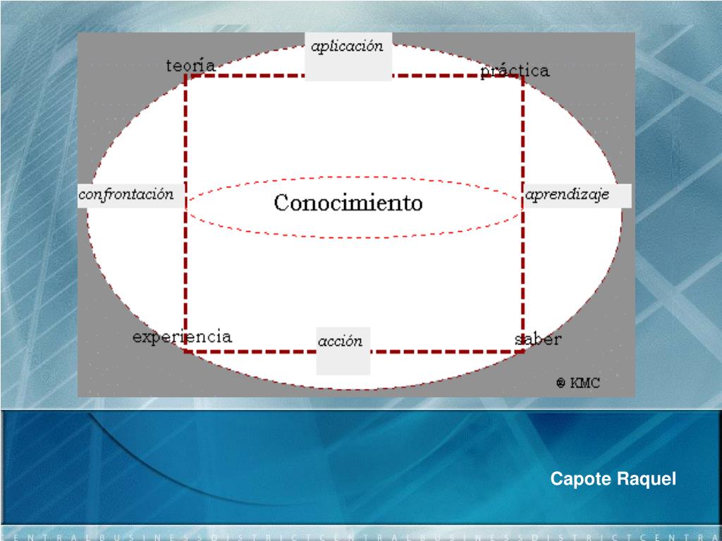 Resultados que debemos esperar Uno de los objetivos de la gestión del conocimiento, es lograr que el conocimiento existente forme parte de la rutina del trabajo, y crear un nuevo conocimiento para mejorar el resultado del negocio. Las empresas que basan su estrategia en la Gestión del Conocimiento, serán capaces de diferenciarse del resto del mercado, mostrando rasgos diferenciadores en su estructura, como: Capote Raquel