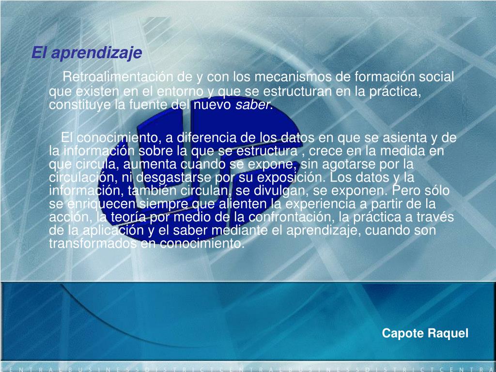 El aprendizaje Retroalimentación de y con los mecanismos de formación social que existen en el entorno y que se estructuran en la práctica, constituye la fuente del nuevo saber. El conocimiento, a diferencia de los datos en que se asienta y de la información sobre la que se estructura, crece en la medida en que circula, aumenta cuando se expone, sin agotarse por la circulación, ni desgastarse por su exposición. Los datos y la información, también circulan, se divulgan, se exponen. Pero sólo se enriquecen siempre que alienten la experiencia a partir de la acción, la teoría por medio de la confrontación, la práctica a través de la aplicación y el saber mediante el aprendizaje, cuando son transformados en conocimiento. Capote Raquel