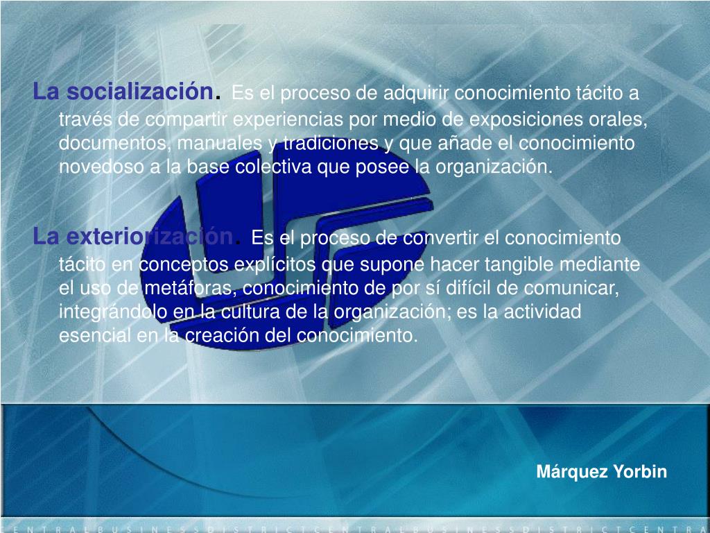La socialización. Es el proceso de adquirir conocimiento tácito a través de compartir experiencias por medio de exposiciones orales, documentos, manuales y tradiciones y que añade el conocimiento novedoso a la base colectiva que posee la organización. La exteriorización. Es el proceso de convertir el conocimiento tácito en conceptos explícitos que supone hacer tangible mediante el uso de metáforas, conocimiento de por sí difícil de comunicar, integrándolo en la cultura de la organización; es la actividad esencial en la creación del conocimiento. Márquez Yorbin