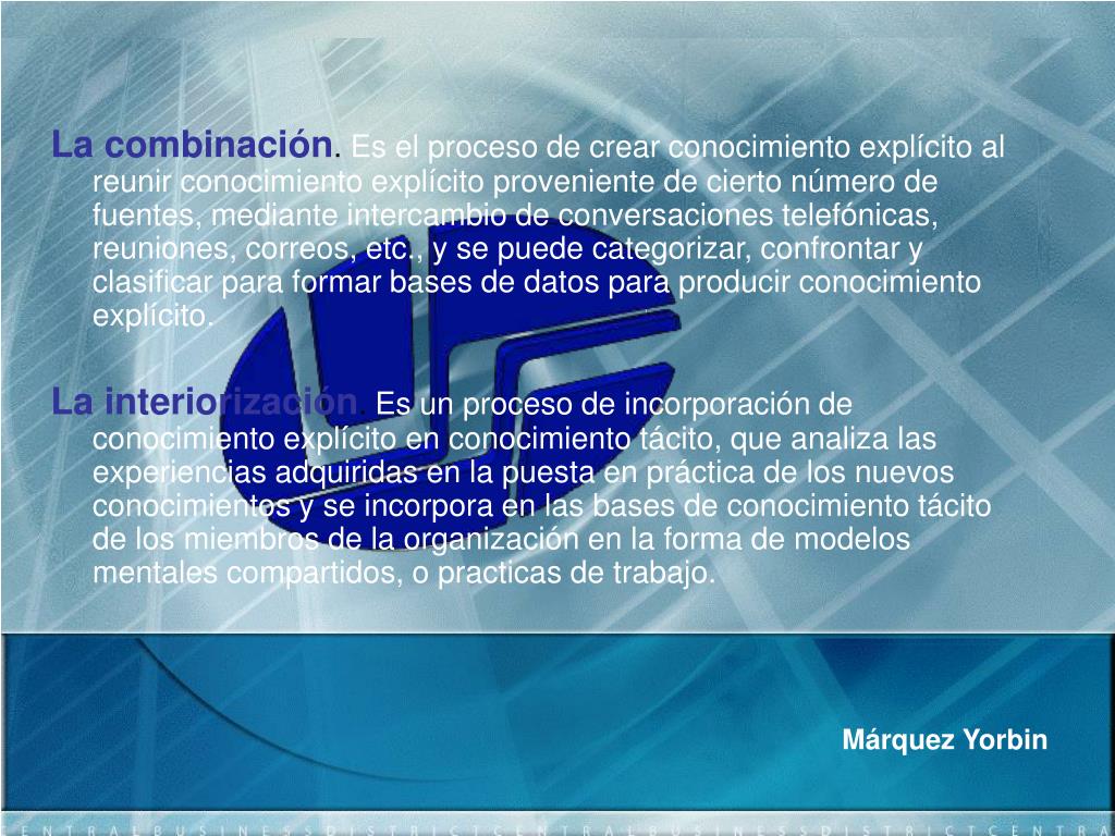 La combinación. Es el proceso de crear conocimiento explícito al reunir conocimiento explícito proveniente de cierto número de fuentes, mediante intercambio de conversaciones telefónicas, reuniones, correos, etc., y se puede categorizar, confrontar y clasificar para formar bases de datos para producir conocimiento explícito. La interiorización. Es un proceso de incorporación de conocimiento explícito en conocimiento tácito, que analiza las experiencias adquiridas en la puesta en práctica de los nuevos conocimientos y se incorpora en las bases de conocimiento tácito de los miembros de la organización en la forma de modelos mentales compartidos, o practicas de trabajo. Márquez Yorbin