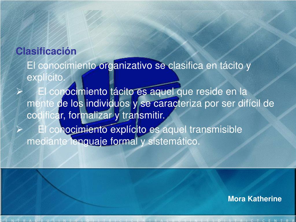 Clasificación El conocimiento organizativo se clasifica en tácito y explícito. • El conocimiento tácito es aquel que reside en la mente de los individuos y se caracteriza por ser difícil de codificar, formalizar y transmitir. • El conocimiento explícito es aquel transmisible mediante lenguaje formal y sistemático. Mora Katherine