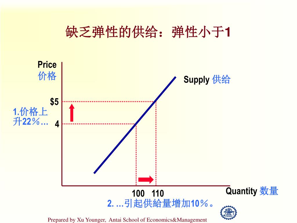 Supply供给 $5 1.价格上 升22%… 4 100 110 2. …引起供給量增加10%。 缺乏弹性的供给:弹性小于1 Price 价格 Quantity 数量