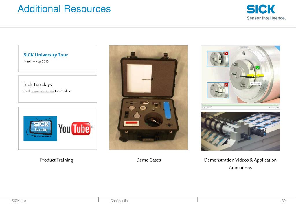 Additional Resources SICK University TourMarch – May 2013 Tech Tuesdays Check www.sickusa.com for schedule Product Training Demo Cases Demonstration Videos & Application Animations