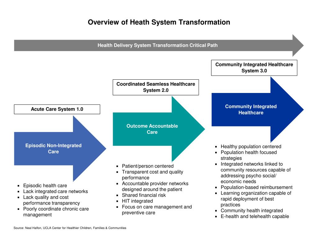 Overview of Heath System Transformation Health Delivery System Transformation Critical Path Community Integrated Healthcare System 3.0 Community Integrated Healthcare Coordinated Seamless Healthcare System 2.0 Outcome Accountable Care Acute Care System 1.0 Episodic Non-Integrated Care • Healthy population centered • Population health focused strategies • Integrated networks linked to community resources capable of addressing psycho social/ economic needs • Population-based reimbursement • Learning organization capable of rapid deployment of best practices • Community health integrated • E-health and telehealth capable • Patient/person centered • Transparent cost and quality performance • Accountable provider networks designed around the patient • Shared financial risk • HIT integrated • Focus on care management and preventive care • Episodic health care • Lack integrated care networks • Lack quality and cost performance transparency • Poorly coordinate chronic care management Source: Neal Halfon, UCLA Center for Healthier Children, Families & Communities
