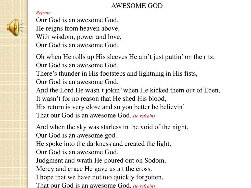 AWESOME GOD Refrain Our God is an awesome God, He reigns from heaven above, With wisdom, power and love, Our God is an awesome God. Oh when He rolls up His sleeves He ain’t just puttin’ on the ritz, Our God is an awesome God. There’s thunder in His footsteps and lightning in His fists, Our God is an awesome God. And the Lord He wasn’t jokin’ when He kicked them out of Eden, It wasn’t for no reason that He shed His blood, His return is very close and so you better be believin’ That our God is an awesome God. (to refrain) And when the sky was starless in the void of the night, Our God is an awesome god. He spoke into the darkness and created the light, Our God is an awesome God. Judgment and wrath He poured out on Sodom, Mercy and grace He gave us a t the cross. I hope that we have not too quickly forgotten, That our God is an awesome God.(to refrain)