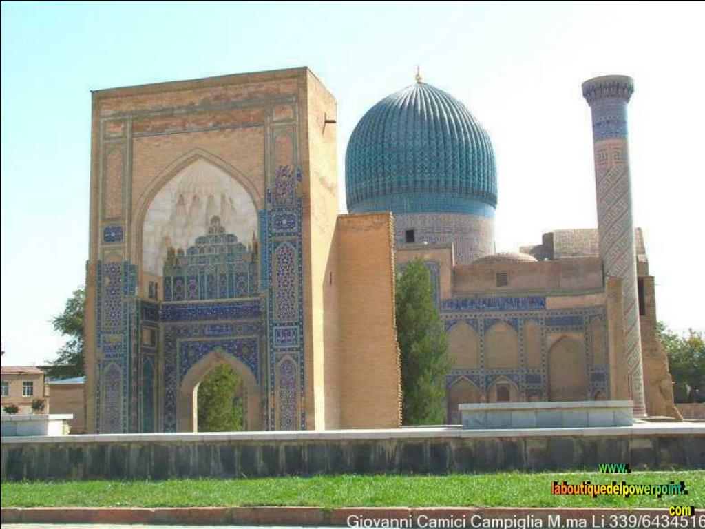 Las campañas de Tamerlán fueron tan brillantes como genocidas, ordenó el asesinato de poblaciones enteras, arrasando ciudades como Bagdad, Damasco,…en cuyas plazas principales acumulaba las cabezas decapitadas de sus habitantes. A ésta actitud se oponía un inusitado interés cultural, lo que favoreció enormemente el desarrollo arquitectónico de Samarcanda. Consiguió que la Ruta de la Seda , principal ruta comercial de Asia, se viese libre de peligros para los comerciantes, lo que impulsó la riqueza y el intercambio cultural con otros pueblos. Ruy González de Clavijo llega a la corte de Tamerlán en septiembre de 1404 y presencia la partida de éste hacia la conquista de China, intento frustrado, ya que Tamerlán muere por enfermedad en febrero de 1405. La revuelta que sigue a la muerte del mongol supone la incautación de los bienes y presentes que Ruy González llevaba para agasajar a Tamerlán. Fracasada la misión, regresa a Castilla dónde muere en 1412, siendo enterrado en la Iglesia de S. Francisco el Grande en Madrid. De las maravillas que Ruy González de Clavijo Clavijo pudo ver , son reflejo las siguientes imágenes : www. laboutiquedelpowerpoint. com