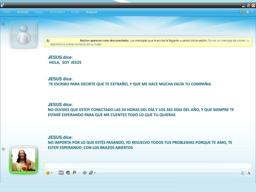 JESUS dice:HOLA, SOY JESÚS JESUS dice: TE ESCRIBO PARA DECIRTE QUE TE EXTRAÑO, Y QUE ME HACE MUCHA FALTA TU COMPAÑIA JESUS dice:NO OLVIDES QUE ESTOY CONECTADO LAS 24 HORAS DEL DÍA Y LOS 365 DÍAS DEL AÑO, Y QUE SIEMPRE TE ESTARÉ ESPERANDO PARA QUE ME CUENTES TODO LO QUE TU QUIERAS JESUS dice:NO IMPORTA POR LO QUE ESTÉS PASANDO, YO RESUELVO TODOS TUS PROBLEMAS PORQUE TE AMO, TE ESTOY ESPERANDO CON LOS BRAZOS ABIERTOS