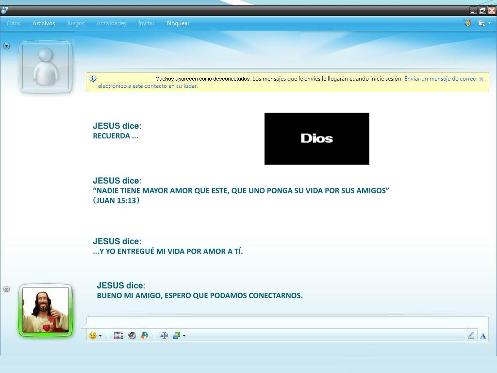 JESUS dice:RECUERDA … JESUS dice:“NADIE TIENE MAYOR AMOR QUE ESTE, QUE UNO PONGA SU VIDA POR SUS AMIGOS”(JUAN 15:13) JESUS dice:…Y YO ENTREGUÉ MI VIDA POR AMOR A TÍ. JESUS dice:BUENO MI AMIGO, ESPERO QUE PODAMOS CONECTARNOS.