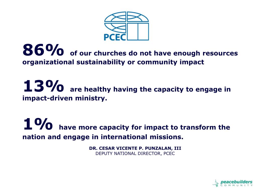 86% of our churches do not have enough resources organizational sustainability or community impact 13% are healthy having the capacity to engage in impact-driven ministry. 1% have more capacity for impact to transform the nation and engage in international missions. DR. CESAR VICENTE P. PUNZALAN, IIIDEPUTY NATIONAL DIRECTOR, PCEC