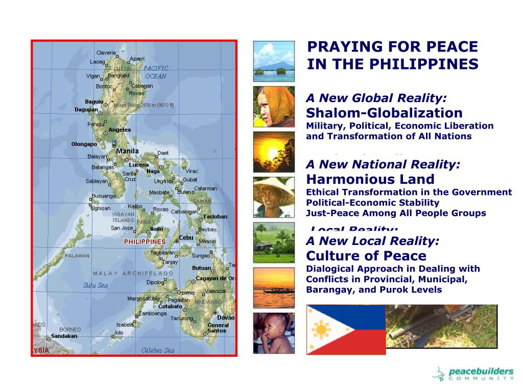 PRAYING FOR PEACE IN THE PHILIPPINES Spanish Colony 1521-1897 A New Global Reality:Shalom-GlobalizationMilitary, Political, Economic Liberationand Transformation of All Nations Global Reality:Unjust GlobalismMilitary, Political, Economic Suppressionand Oppression of Poor Nations National Reality:Conflicted LandCorruption in the GovernmentPolitical-Economic InstabilityArmed Conflicts: CPP-NPA, MILF, ASG Local Reality:Violence of InjusticeDynasties and Warlords in Provincial, Municipal, Barangay, and Purok Levels American Colony 1898-1933 War & “Independence” 1934-1964 US-Backed Dictatorship 1965-1986 Corruption and Unrest 1987-2009 A New National Reality:Harmonious LandEthical Transformation in the GovernmentPolitical-Economic StabilityJust-Peace Among All People Groups A New Local Reality:Culture of PeaceDialogical Approach in Dealing with Conflicts in Provincial, Municipal,Barangay, and Purok Levels