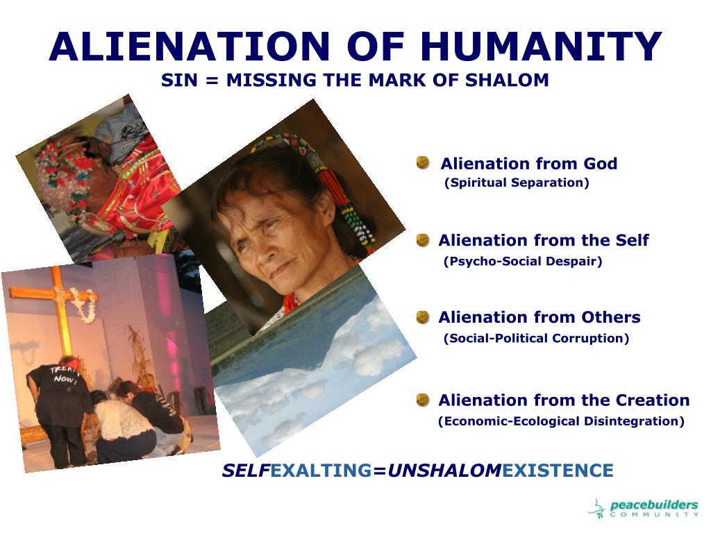 ALIENATION OF HUMANITY SIN = MISSING THE MARK OF SHALOM • Alienation from God(Spiritual Separation) • Alienation from the Self(Psycho-Social Despair) • Alienation from Others (Social-Political Corruption) • Alienation from the Creation(Economic-Ecological Disintegration) SELFEXALTING=UNSHALOMEXISTENCE