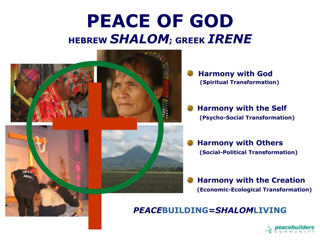 PEACE OF GOD HEBREW SHALOM; GREEK IRENE • Harmony with God(Spiritual Transformation) • Harmony with the Self(Psycho-Social Transformation) • Harmony with Others (Social-Political Transformation) • Harmony with the Creation(Economic-Ecological Transformation) PEACEBUILDING=SHALOMLIVING