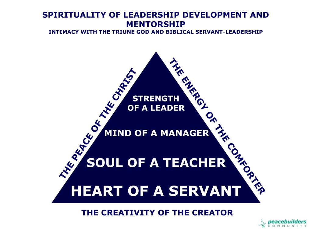 SPIRITUALITY OF LEADERSHIP DEVELOPMENT AND MENTORSHIP INTIMACY WITH THE TRIUNE GOD AND BIBLICAL SERVANT-LEADERSHIP STRENGTHOF A LEADER THE PEACE OF THE CHRIST THE ENERGY OF THE COMFORTER MIND OF A MANAGER SOUL OF A TEACHER HEART OF A SERVANT THE CREATIVITY OF THE CREATOR