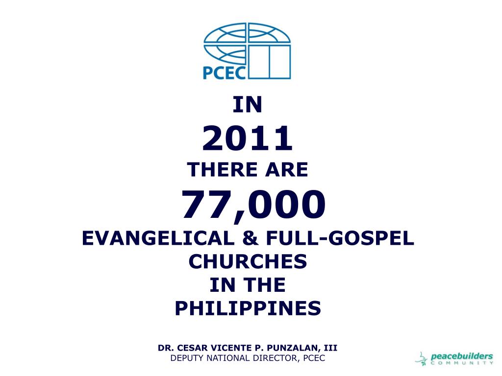 IN 2011 THERE ARE 77,000 EVANGELICAL & FULL-GOSPEL CHURCHES IN THE PHILIPPINES DR. CESAR VICENTE P. PUNZALAN, III DEPUTY NATIONAL DIRECTOR, PCEC