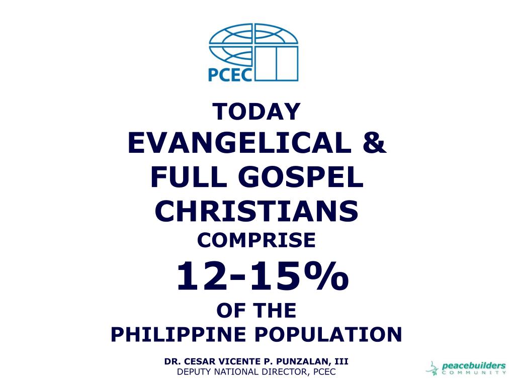 TODAY EVANGELICAL &FULL GOSPELCHRISTIANS COMPRISE 12-15% OF THE PHILIPPINE POPULATION DR. CESAR VICENTE P. PUNZALAN, III DEPUTY NATIONAL DIRECTOR, PCEC