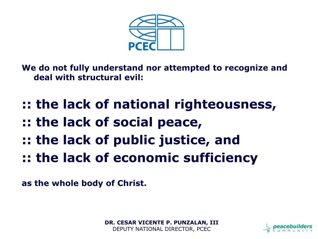 We do not fully understand nor attempted to recognize and deal with structural evil: :: the lack of national righteousness, :: the lack of social peace, :: the lack of public justice, and :: the lack of economic sufficiency as the whole body of Christ. DR. CESAR VICENTE P. PUNZALAN, III DEPUTY NATIONAL DIRECTOR, PCEC