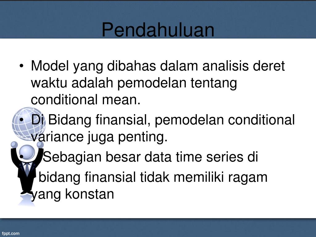 Pendahuluan • Model yang dibahasdalamanalisisderetwaktuadalahpemodelantentang conditional mean. • Di Bidangfinansial, pemodelan conditional variance jugapenting. • Sebagianbesar data time series di • bidangfinansialtidakmemilikiragam yang konstan