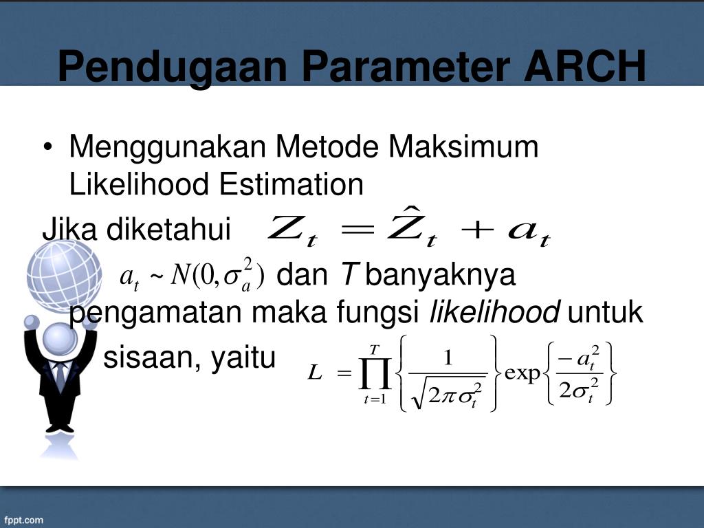 Untuk model ARCH(1) yang memiliki persamaan maka fungsi likelihood untuk sisaannya adalah • Untuk model ARCH(m) , tinggal • disesuaikan
