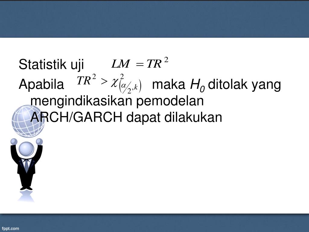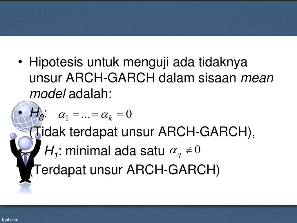 Hipotesis untuk menguji ada tidaknya unsur ARCH-GARCH dalam sisaan mean model adalah: • H0: (Tidak terdapat unsur ARCH-GARCH), • H1: minimal ada satu (Terdapat unsur ARCH-GARCH)