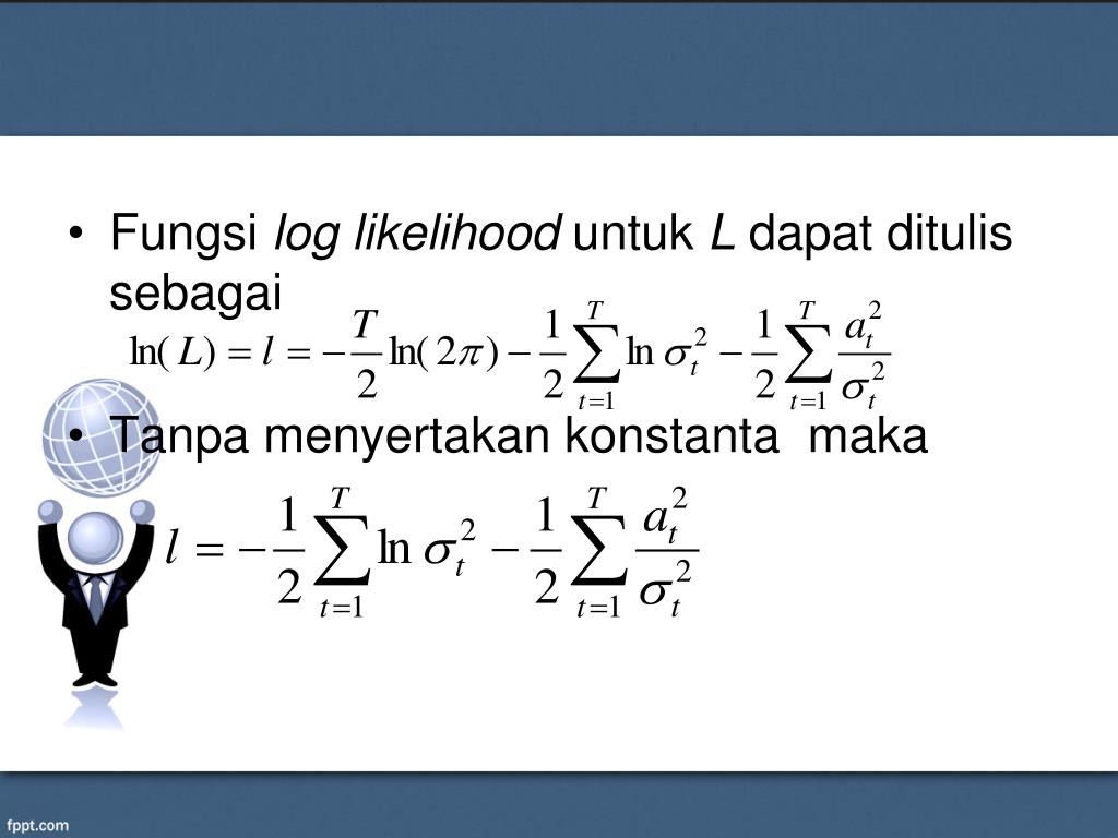 Fungsi log likelihood untuk L dapat ditulis sebagai • Tanpa menyertakan konstanta maka