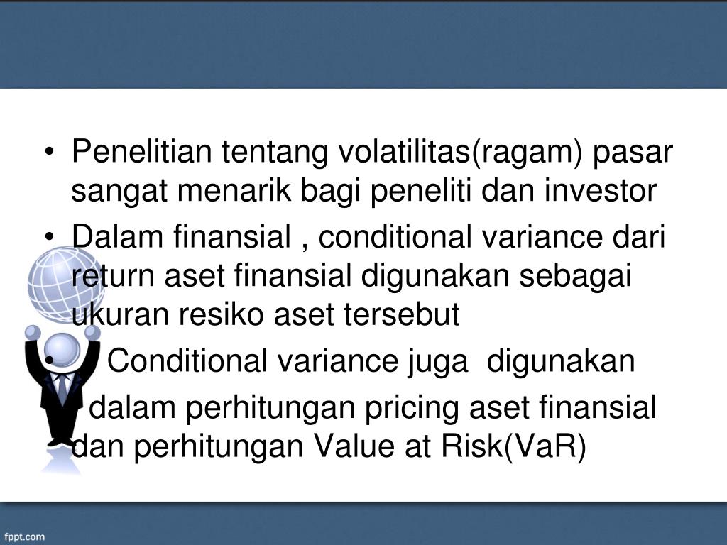 Penelitiantentangvolatilitas(ragam) pasarsangatmenarikbagipenelitidan investor • Dalamfinansial , conditional variance dari return asetfinansialdigunakansebagaiukuranresikoasettersebut • Conditional variance jugadigunakan • dalamperhitungan pricing asetfinansialdanperhitungan Value at Risk(VaR)