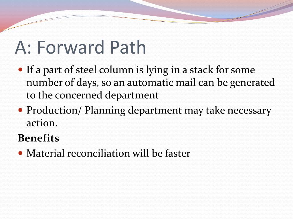 A: Forward Path • If a part of steel column is lying in a stack for some number of days, so an automatic mail can be generated to the concerned department • Production/ Planning department may take necessary action. Benefits • Material reconciliation will be faster