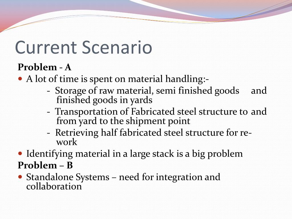Current Scenario Problem - A • A lot of time is spent on material handling:- - Storage of raw material, semi finished goods and finished goods in yards - Transportation of Fabricated steel structure to and from yard to the shipment point - Retrieving half fabricated steel structure for re- work • Identifying material in a large stack is a big problem Problem – B • Standalone Systems – need for integration and collaboration