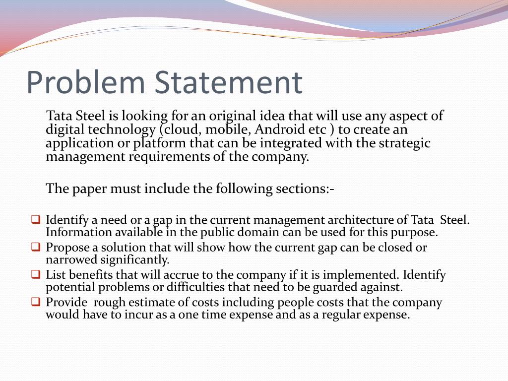 Problem Statement Tata Steel is looking for an original idea that will use any aspect of digital technology (cloud, mobile, Android etc ) to create an application or platform that can be integrated with the strategic management requirements of the company. The paper must include the following sections:- • Identify a need or a gap in the current management architecture of Tata Steel. Information available in the public domain can be used for this purpose. • Propose a solution that will show how the current gap can be closed or narrowed significantly. • List benefits that will accrue to the company if it is implemented. Identify potential problems or difficulties that need to be guarded against. • Provide rough estimate of costs including people costs that the company would have to incur as a one time expense and as a regular expense.