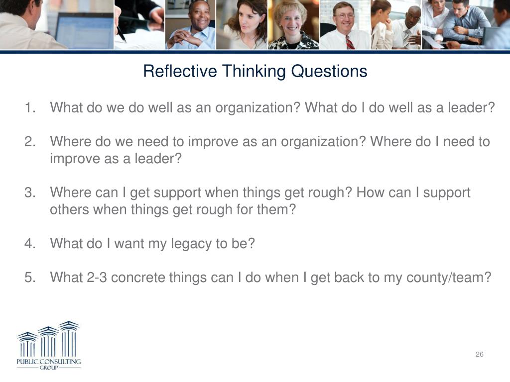 Reflective Thinking Questions • What do we do well as an organization? What do I do well as a leader? • Where do we need to improve as an organization? Where do Ineed to improve as a leader? • Where can I get support when things get rough? How can I support others when things get rough for them? • What do I want my legacy to be? • What 2-3 concrete things can I do when I get back to my county/team?