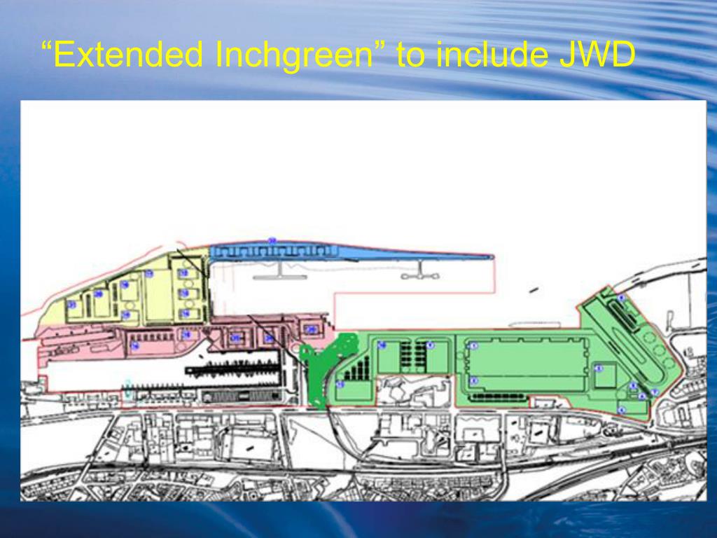 Inchgreen Key Features • 203,000 square metres • Dry dock 304.8m x 47.5m • Quayside 420m • Hard standing area 60m x 95m • Re-inforced module mat 100m x 80m • Min/max water depth at low tide 8.2m (low tide)/11.3m (high tide) • 15-70 tonnecranage • “Extended Inchgreen” potential (of up to 367,000 square metres)